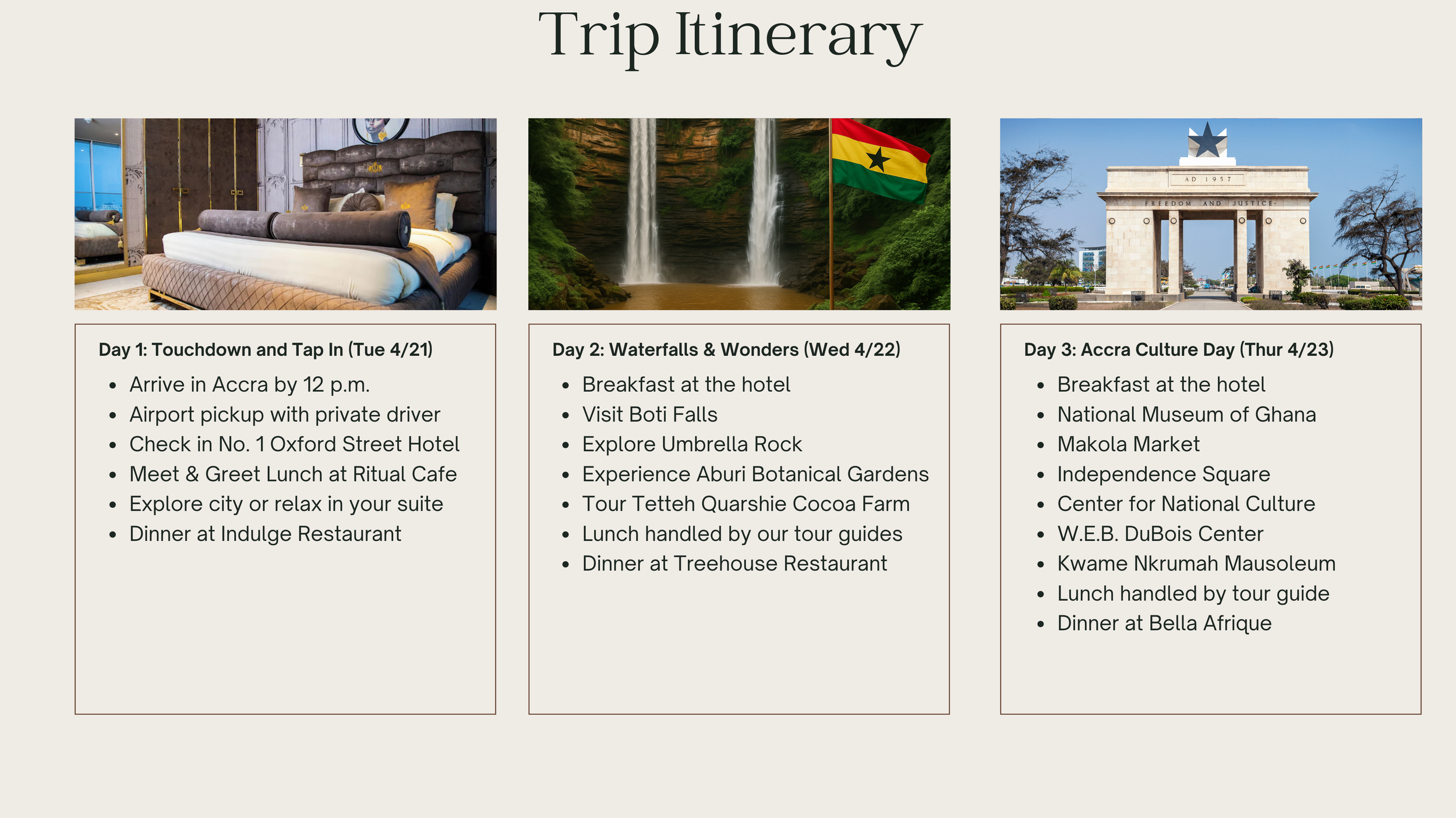 It is giving relaxation, healing, and full rejuvenation. After breakfast, enjoy a complete spa day at No. 1 Oxford Street Hotel with a complimentary massage because the Gudlyfe always includes self care. Then we head to Labadi Beach for sun kissed vibes, ocean breeze, and laid back energy. Lunch is served at Afrikana Beach House and dinner later takes place at the Accra Marriott Hotel. This is your recharge day to bring your body and spirit back to center.